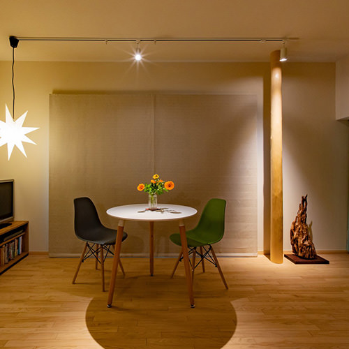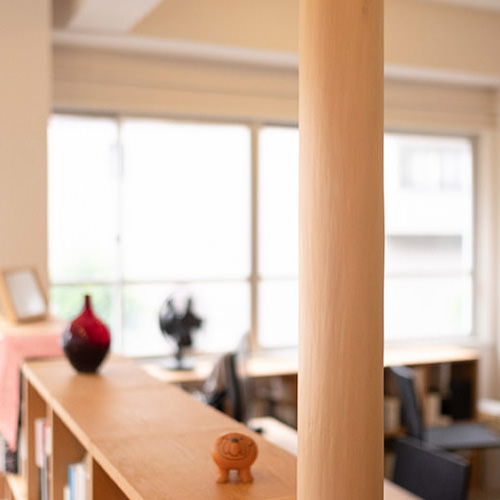 空間に一本あるだけで、間が変わり、新たな意味合いをもたらす。主に、磨き丸太、天然絞り丸太、人工絞り丸太を素材として、一本だけ立てて凛とした空間を創ります。とくに和洋室(和モダン)な空間には、天然絞りが似合います。
